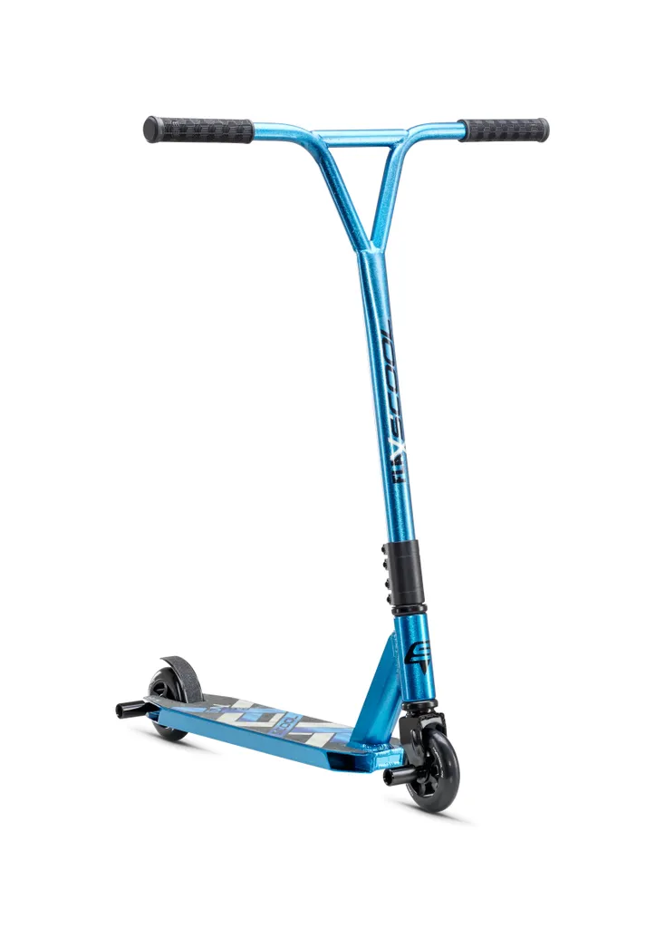 Robustná konštrukcia kolobežky typu FlaX 8.6 v žiarivom prevedení „Metalickej modrej“ alebo „Metalickej zlatej“ je masívnejšou alternatívou kolobežky. Je ideálna pre triky a jazdy na rampe.